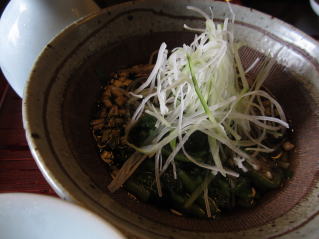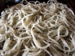 実際の「しそ切りそば」は非常に透明感のある蕎麦でした。紫蘇の葉が混ぜ込んであるのが分かります。食感も確かで、ゆで加減が絶妙。これが清涼感のある、まさに夏に合った蕎麦です。……ここは3タイプの蕎麦を揃えているので、準備の手間が大変だろうなと推測できます。