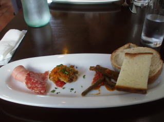 「前菜3種盛」です。パンが2種類、それに生ハムやパプリカなどが盛られています。