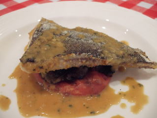 添えてあるのは、新種のカリフラワー「ロマネスク」。下には赤カブのポテトサラダがありますね。こちらは私のコースの魚料理です。