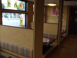 店外周部にそったテーブル席と、中央部のテーブル席。道路側の座敷席から成り立っています。店内は非常に綺麗で、明るい感じです。