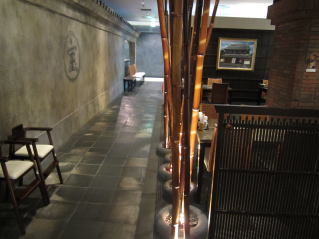 店内は漆喰壁や和紙を用いた壁、シックなタイル床に竹材が立ち並ぶ、お洒落な和風空間です。こちらは画面の右手側にテーブル席が並んでいます。