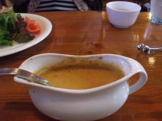 ランチなので、「サラダ」「スープ」「パン or ライス」「ドリンク」が付いてきます。こちらの店は、食材にこだわりがあるようで、レジ前で有機栽培野菜やドレッシングを販売していました。 このカレールーに見えるものは、ドレッシング。