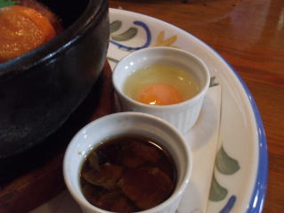 ソースと卵が添えてあります。こちらは嫁の頼んだ「石焼鍋ビーフハンバーグ」(1150円)。私のより、一回りサイズが小さいです。 こちら、ソースとハンバーグ。 石焼き鍋の中のハンバーグに、それぞれかけて食べます。