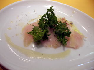 まずは「魚介のカルパッチョ」で、この日は「フッコのカルパッチョ」でした。もっちりした食感がたまりません♪続けてサラダ。